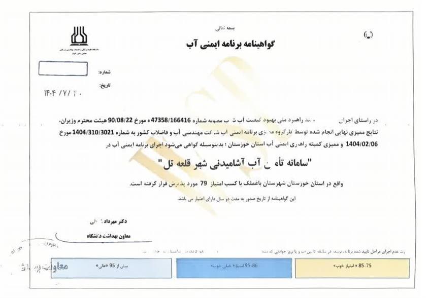از تلاش ها و پیگیری های فراوان برای اخذ گواهینامه برنامه ایمنی آب شهر قلعه تل،